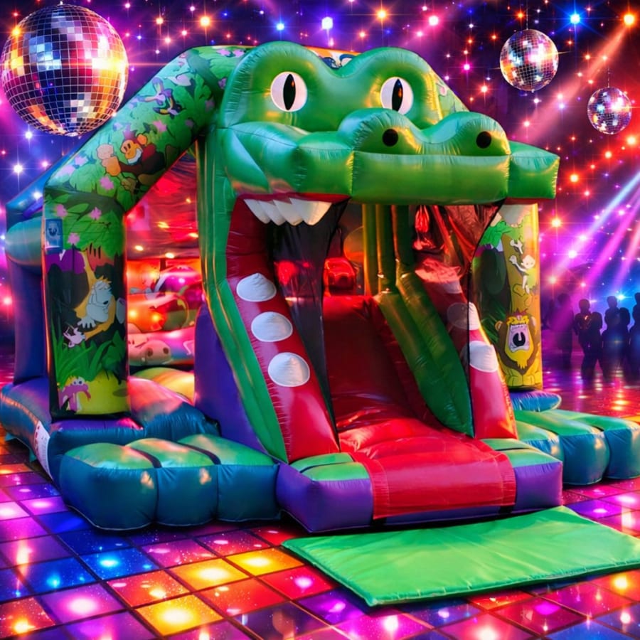 Make your next event a roaring success with the 3D Crocodile Bounce & Slide with Lights and Speaker. Book today and let the adventures begin! 🦖