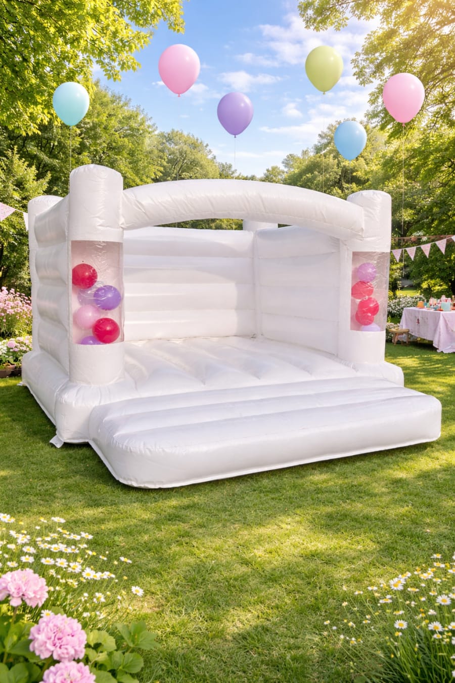 The 12ft x 12ft White Bouncy Castle is a glossy, elegant inflatable with playful balloon juggler. Ideal for indoor events, its low height means its perfect for halls, community centres and school buildings. This 12x12 feet castle delivers style and safe fun for birthdays, ceremonies and boutique events. ✨